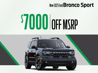 Ex. New 2025 Ford Bronco Sport Outer Banks. VIN:3FMCR9CN6SRE91817. MSRP: $38,090. Selling Price: $31,790. Up to $7,000 off MSRP on select 2025 Bronco Sport Models. Includes all rebates and incentives. Not all will qualify. On select models. Advertised Price EXCLUDES all optional dealer offered items, accessories, or product addendums optionally selected by the purchaser, applicable official taxes and fees, and a $799 SC Dealer Closing Fee. See dealer for details. Offer Expires 05/1/2026.