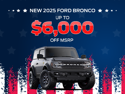 Ex. New 2025 Ford Bronco Badlands 4WD. VIN: 1FMEE9BP0SLB10100. MSRP: $72,895. Up to $6,000 off MSRP. Includes all rebates and incentives. Not all will qualify. On select models. Advertised Price EXCLUDES all optional dealer offered items, accessories, or product addendums optionally selected by the purchaser, applicable official taxes and fees, and a $799 SC Dealer Closing Fee. See dealer for details. Offer Expires 02/28/2026.