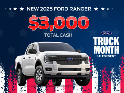 Ex. New 2025 Ford Ranger XL. VIN: 1FTER4BH6SLE77376. MSRP: $36,345. Selling Price: $33,345. $3,000 total cash. Includes all rebates and incentives. Not all will qualify. On select models. 13 available at this offer. Advertised Price EXCLUDES all optional dealer offered items, accessories, or product addendums optionally selected by the purchaser, applicable official taxes and fees, and a $799 SC Dealer Closing Fee. See dealer for details. Offer Expires 03/31/2026.
