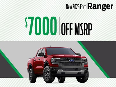 Ex. New 2025 Ford Ranger XLT. VIN: 1FTER4HH6SLE62724.MSRP: $40,520. Selling Price: $35,520. Up to $7,000 off MSRP on select 2025 Ranger Models. Includes all rebates and incentives. Not all will qualify. On select models. Advertised Price EXCLUDES all optional dealer offered items,accessories, or product addendums optionally selected by the purchaser,applicable official taxes and fees, and a $799 SC Dealer Closing Fee. See dealer for details. Offer Expires 05/1/2026.